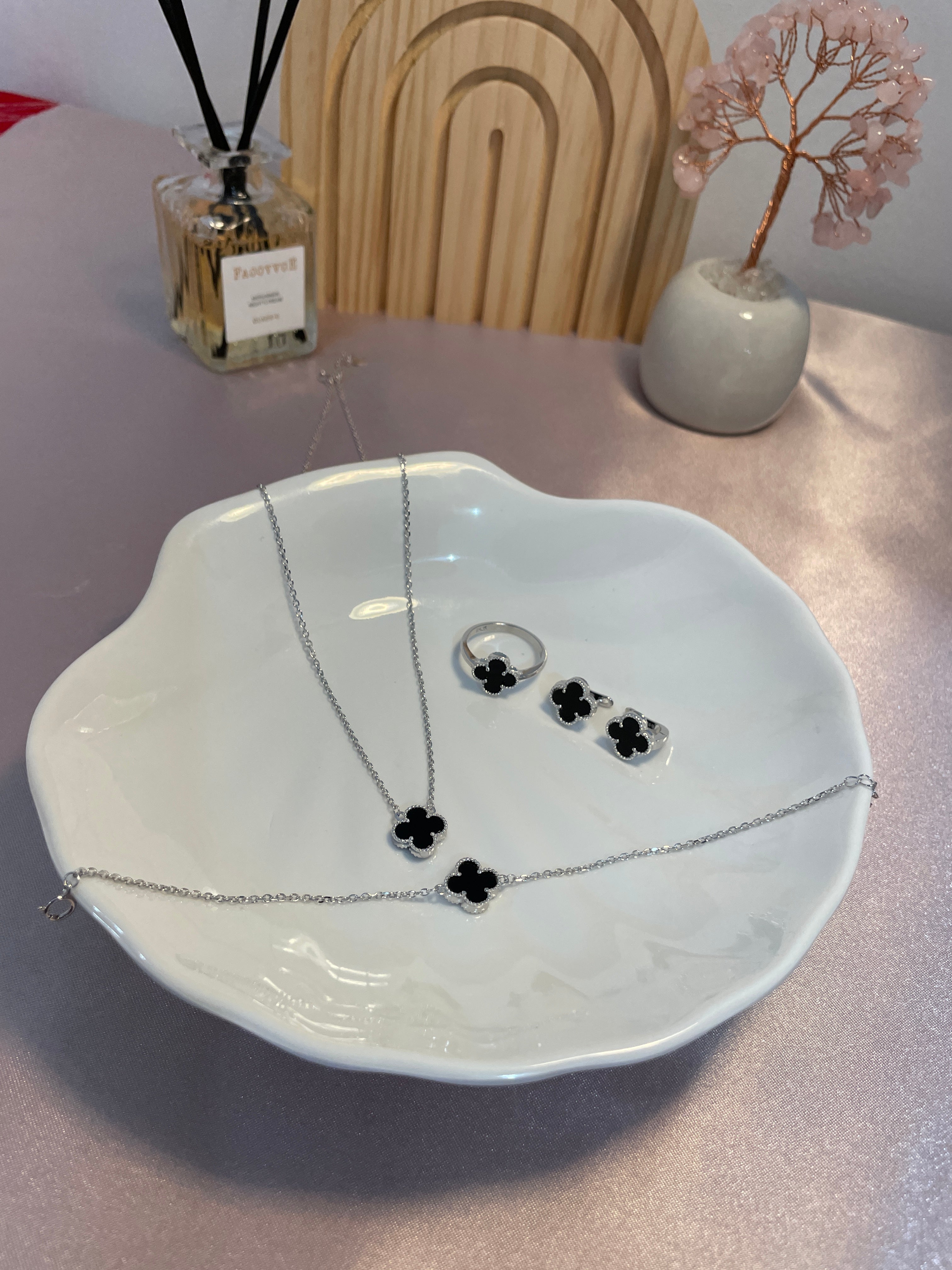 ▪️ Make a bold statement with our Black Clover Leaf Cleef-Style Van Necklace Combo Set. Featuring a sleek black design, this set includes a necklace, bracelet, ring, and earrings, each adorned with delicate clover leaf accents for an elegant and modern look.