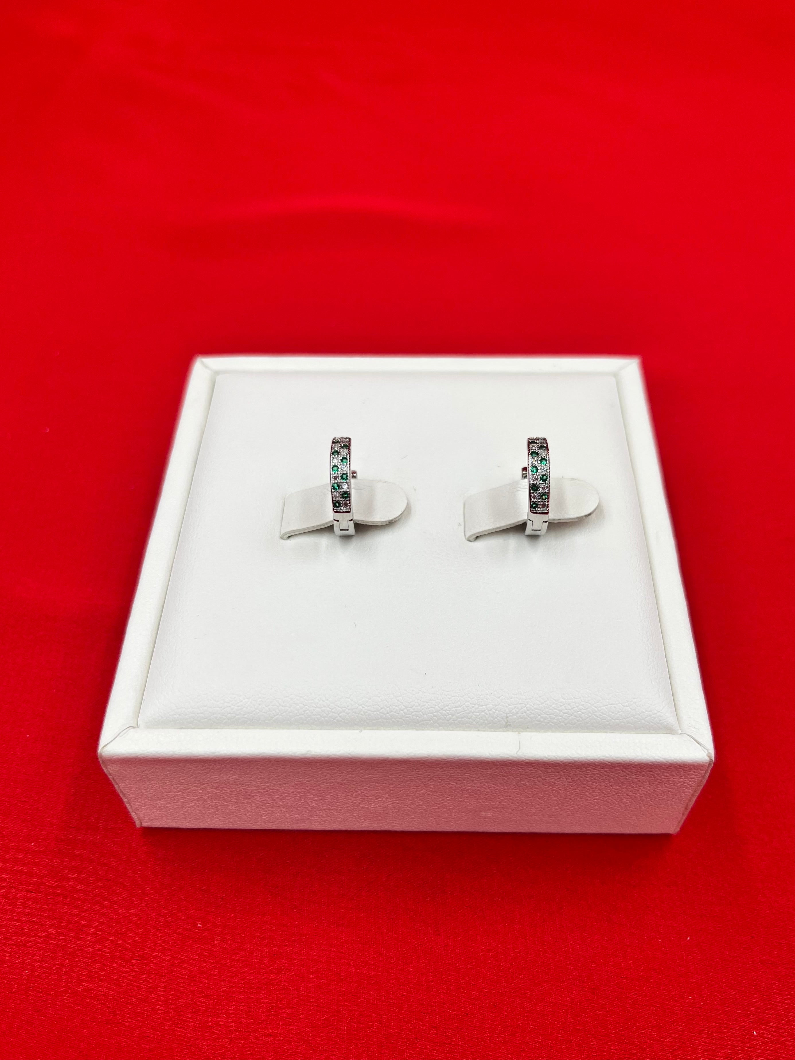 ▪️ Sleek huggie hoop earrings with a sleek design featuring Green stones on the front, offering a subtle, elegant look suitable for both daily wear and special occasions